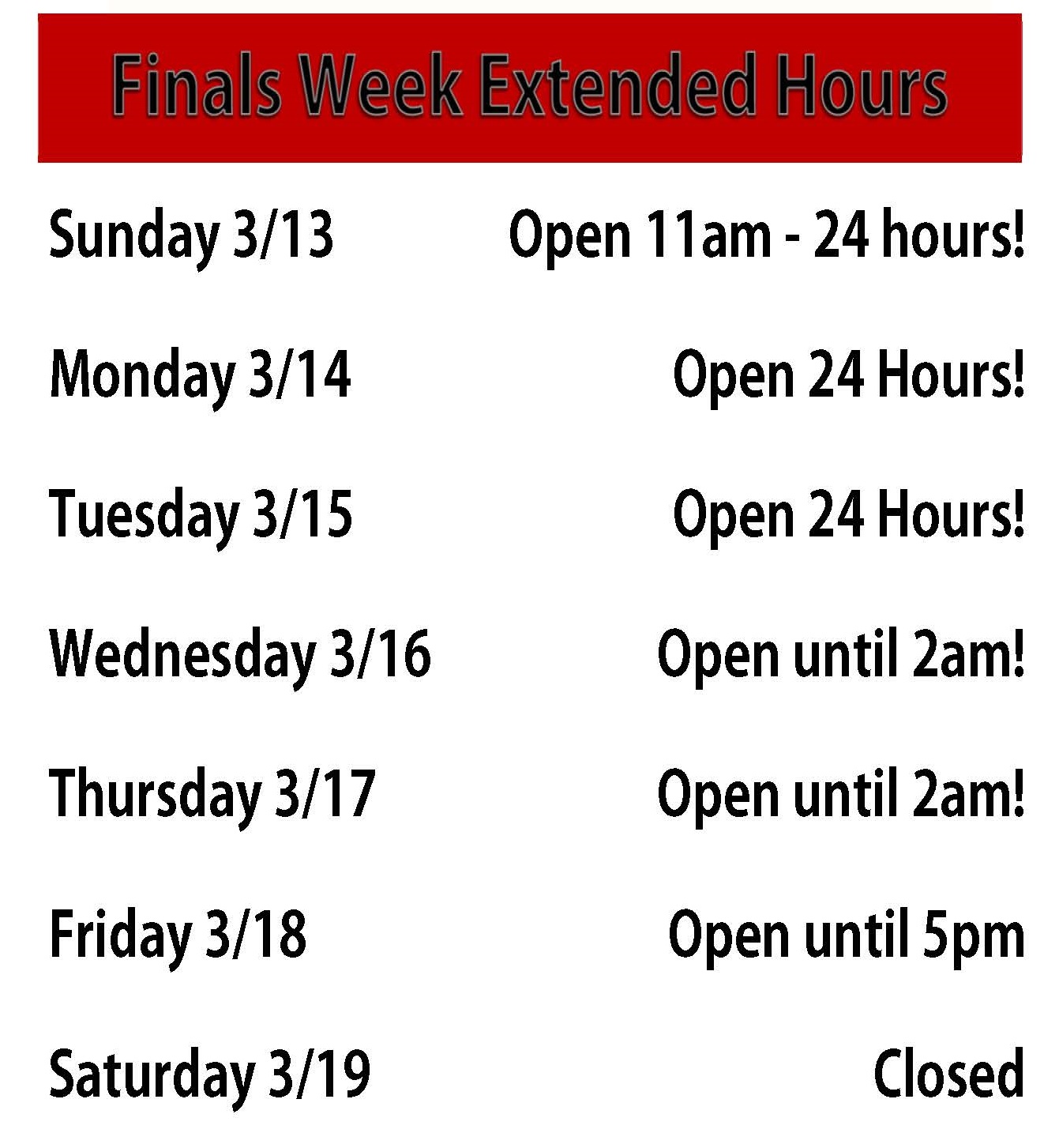 Need more library time to get through the end of the school year? We’ve got extended hours for you during Finals Week: